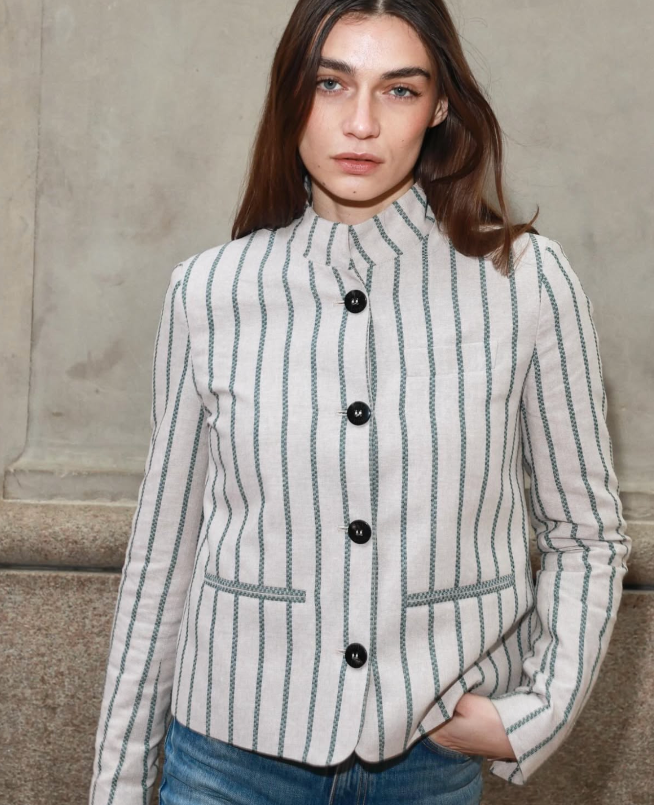 Single-breasted closure with five buttons and three buttons at the cuffs. Mandarin collar. Two front pockets with welt closure and left pocket. Short like a bolero, it enhances the feminine silhouette.