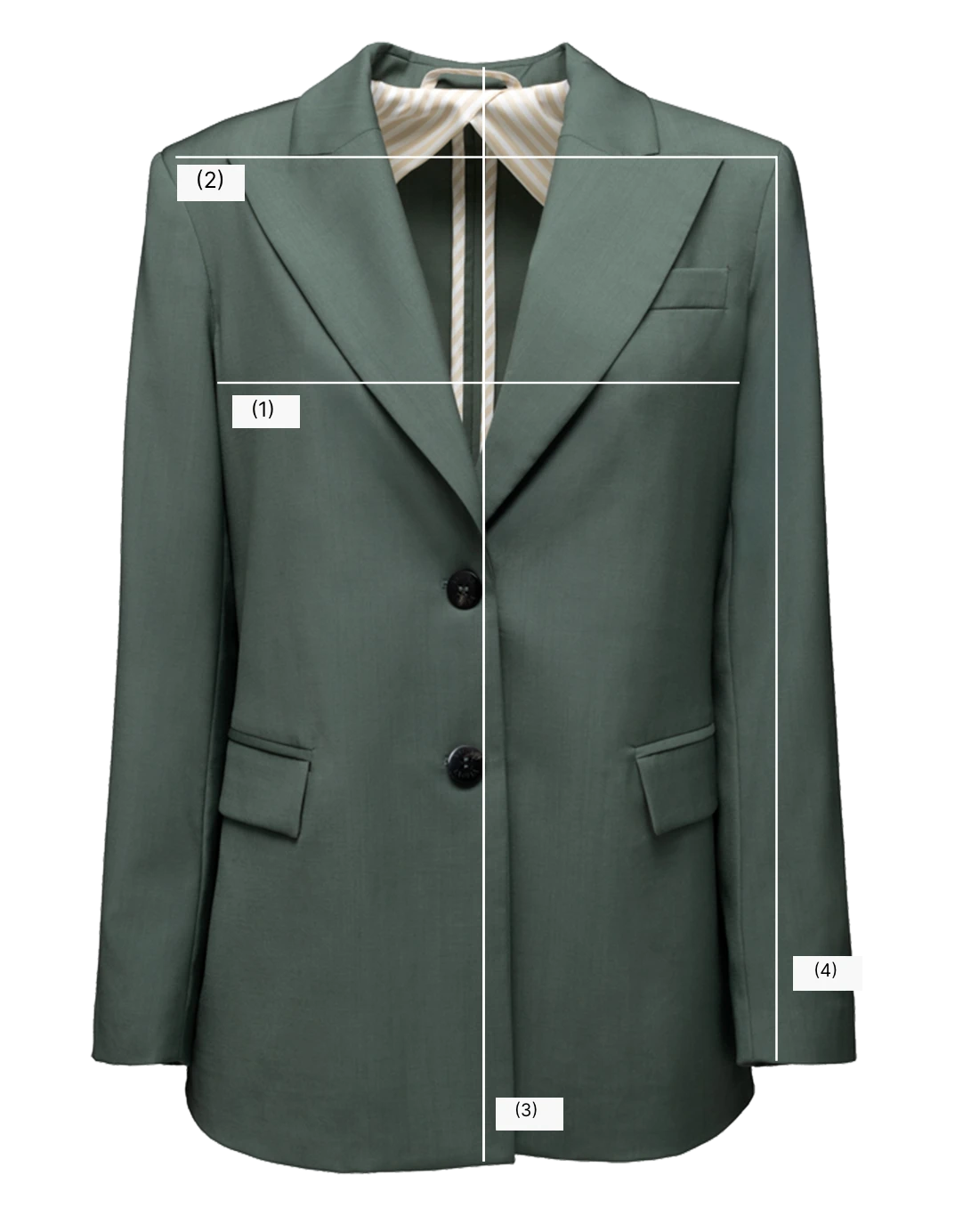 Chiusura mono petto a due bottoni, tre bottoni ai polsi e grandi revers a lancia. Spalle scese e destrutturate. Due tasche frontali chiuse a pattina. Doppio spacco ribattuto sul retro. Semi foderata e taschino interno a un bottone.