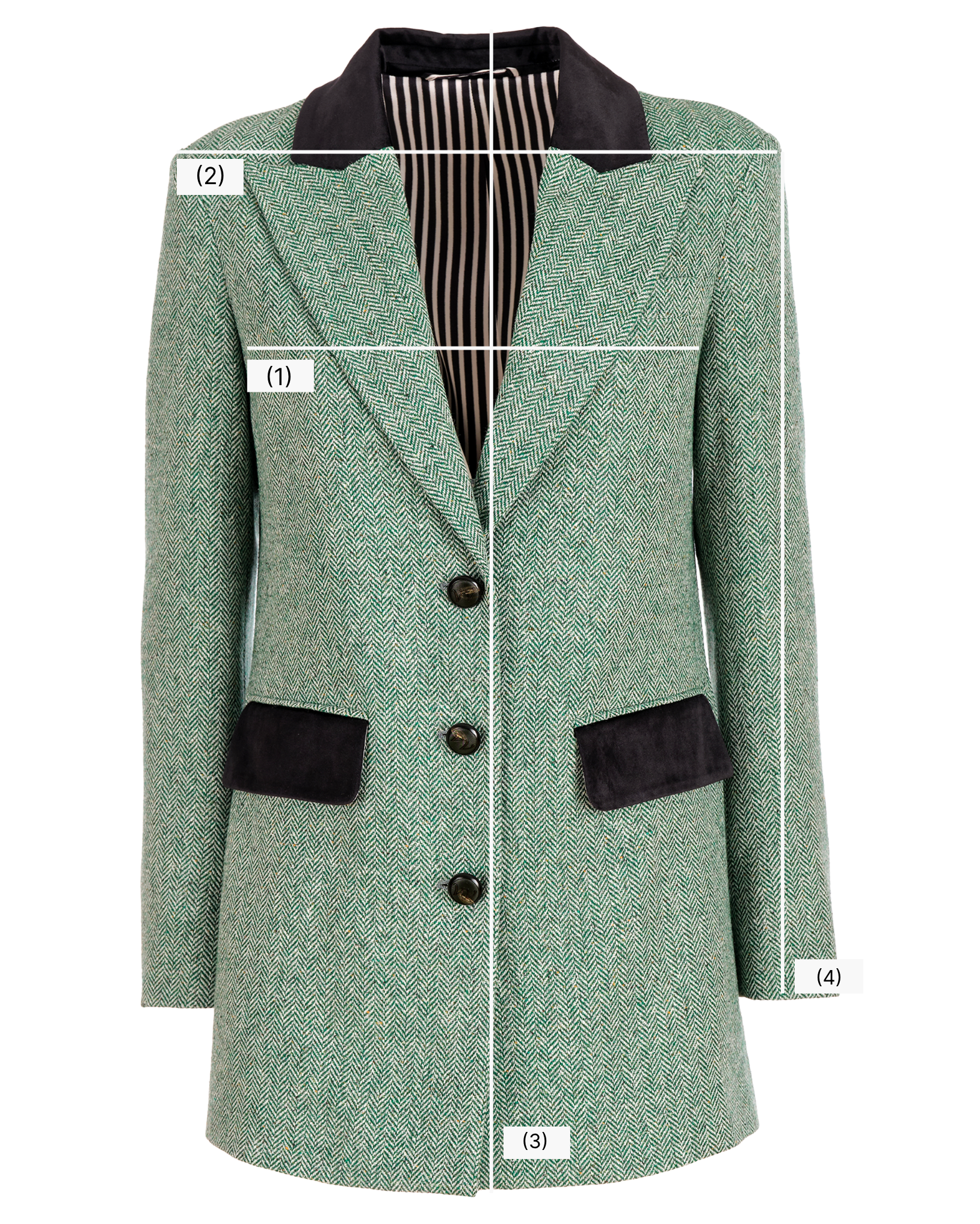 Chiusura mono petto a tre bottoni e tre bottone ai polsi. Revers a lancia. Due tasche frontali chiuse a pattina. Mono spacco ribattuto sul retro.
