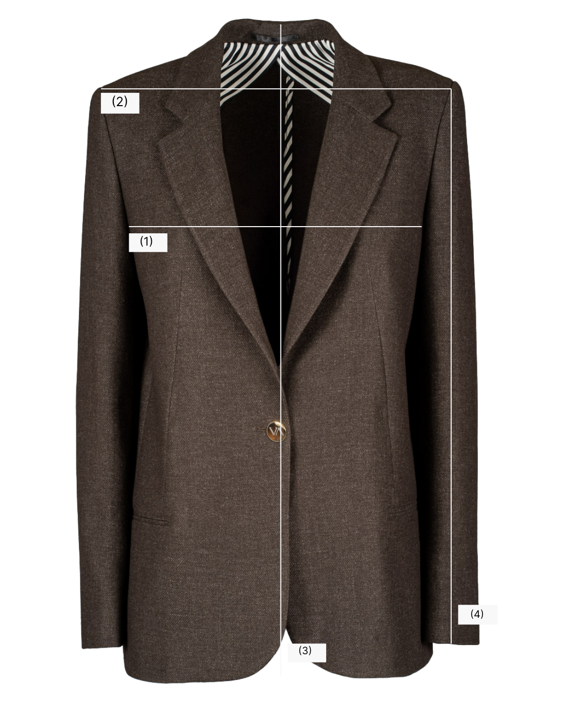 Chiusura mono petto a un bottoni e tre bottoni ai polsi. Spalle dritte. Due tasche chiuse a filetto e pinces frontali. Mono spacco ribattuto sul retro. Semi foderata e taschino interno a un bottone.