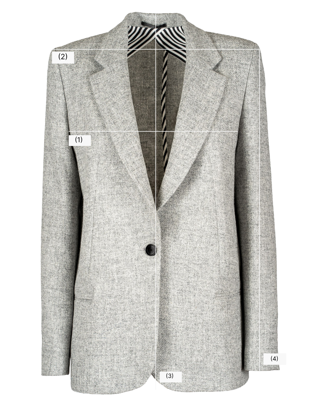 Chiusura mono petto a un bottoni e tre bottoni ai polsi. Spalle dritte. Due tasche chiuse a filetto e pinces frontali. Mono spacco ribattuto sul retro. Semi foderata e taschino interno a un bottone.