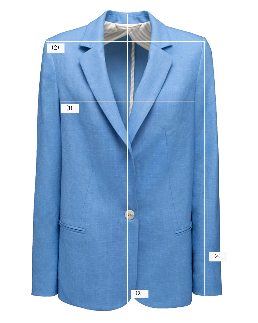 Chiusura mono petto a un bottoni e tre bottoni ai polsi. Spalle dritte. Due tasche chiuse a filetto e pinces frontali. Mono spacco ribattuto sul retro. Semi foderata e taschino interno a un bottone.