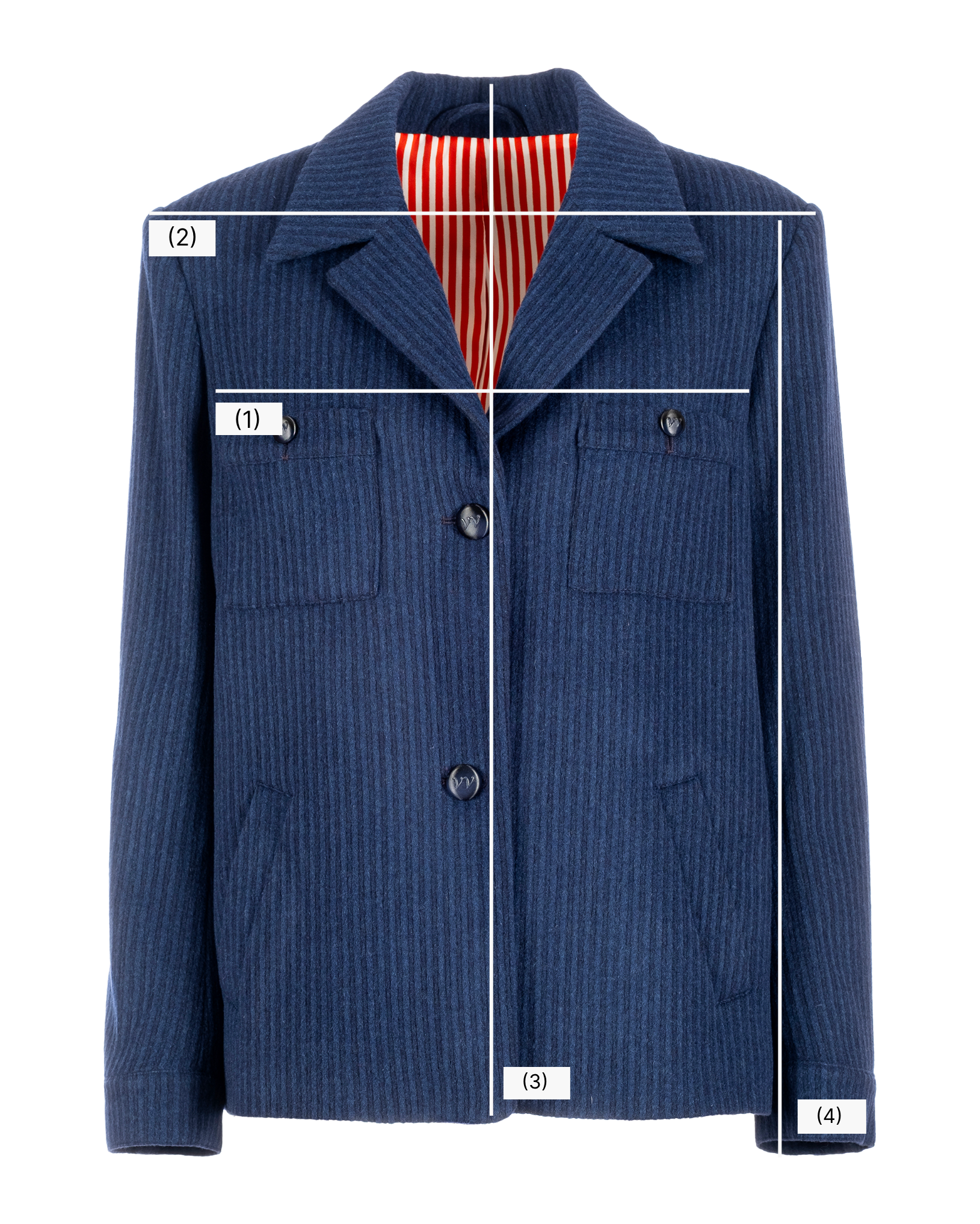 Chiusura mono petto a due bottoni e un bottone ai polsi. Collo a camicia e revers. Quattro tasche frontali, due all'americana, due applicate chiuse a pattina con bottone .