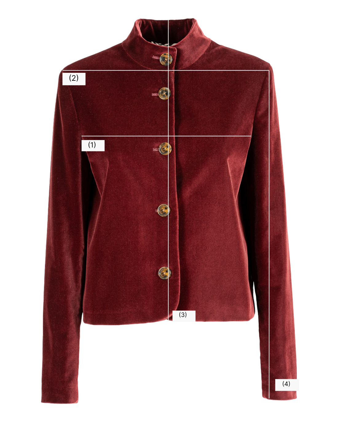 Chiusura mono petto a cinque bottoni e tre bottoni ai polsi. Colletto alla coreana. Due tasche frontali chiuse a filetto. Corta come un bolero, perfetta per esaltare la silhouette.
