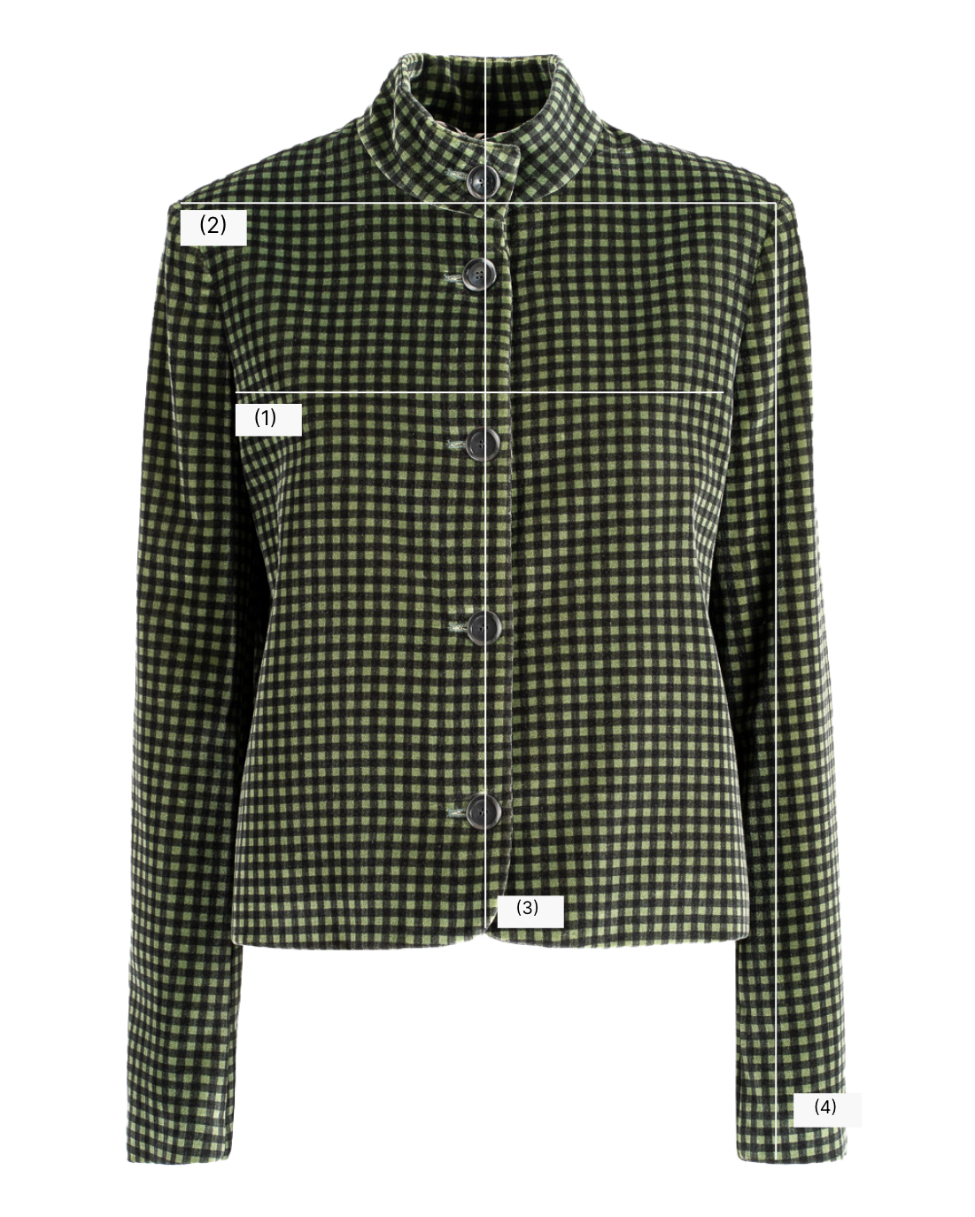 Chiusura mono petto a cinque bottoni e tre bottoni ai polsi. Colletto alla coreana. Due tasche frontali chiuse a filetto. Corta come un bolero, perfetta per esaltare la silhouette.