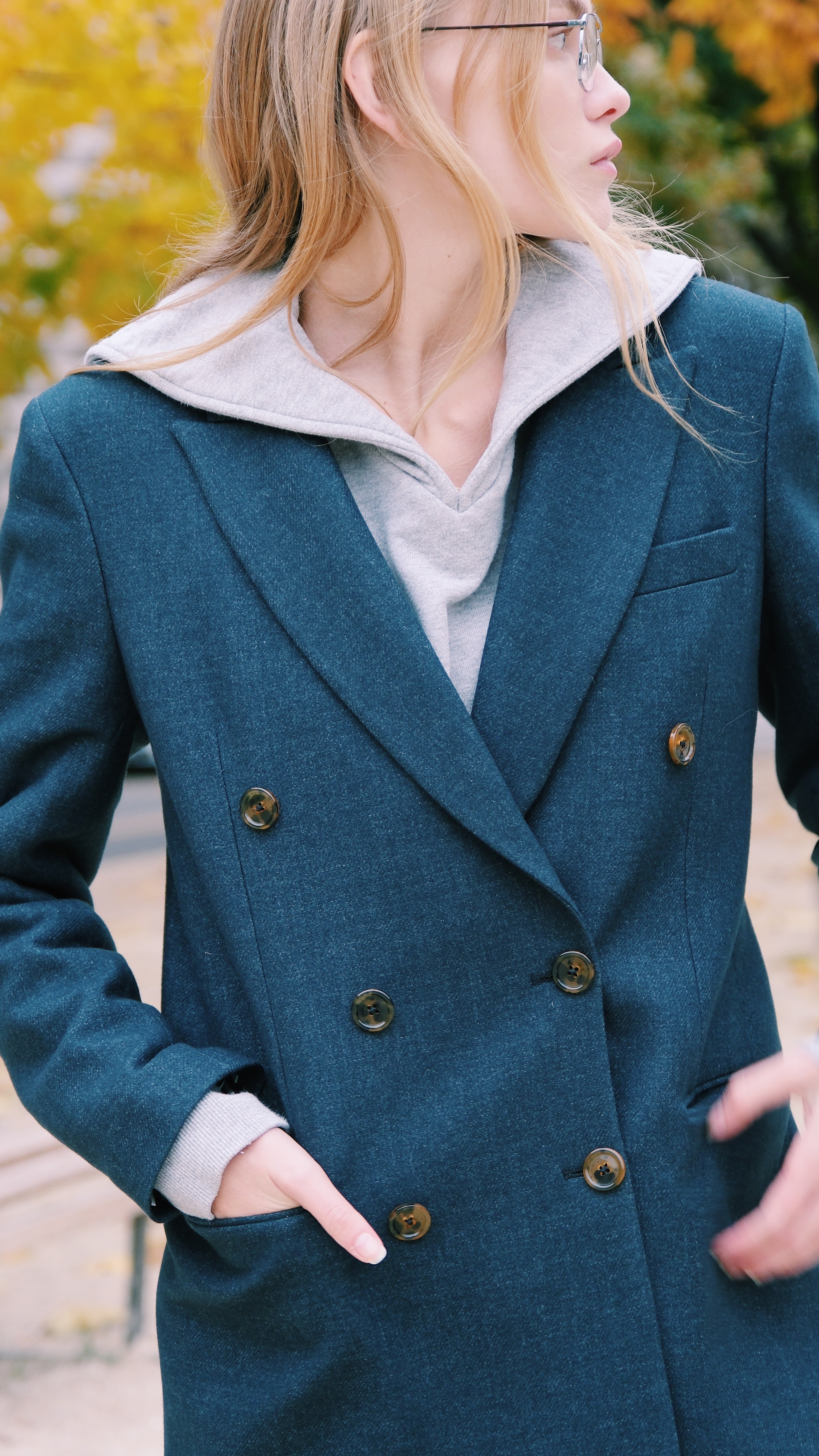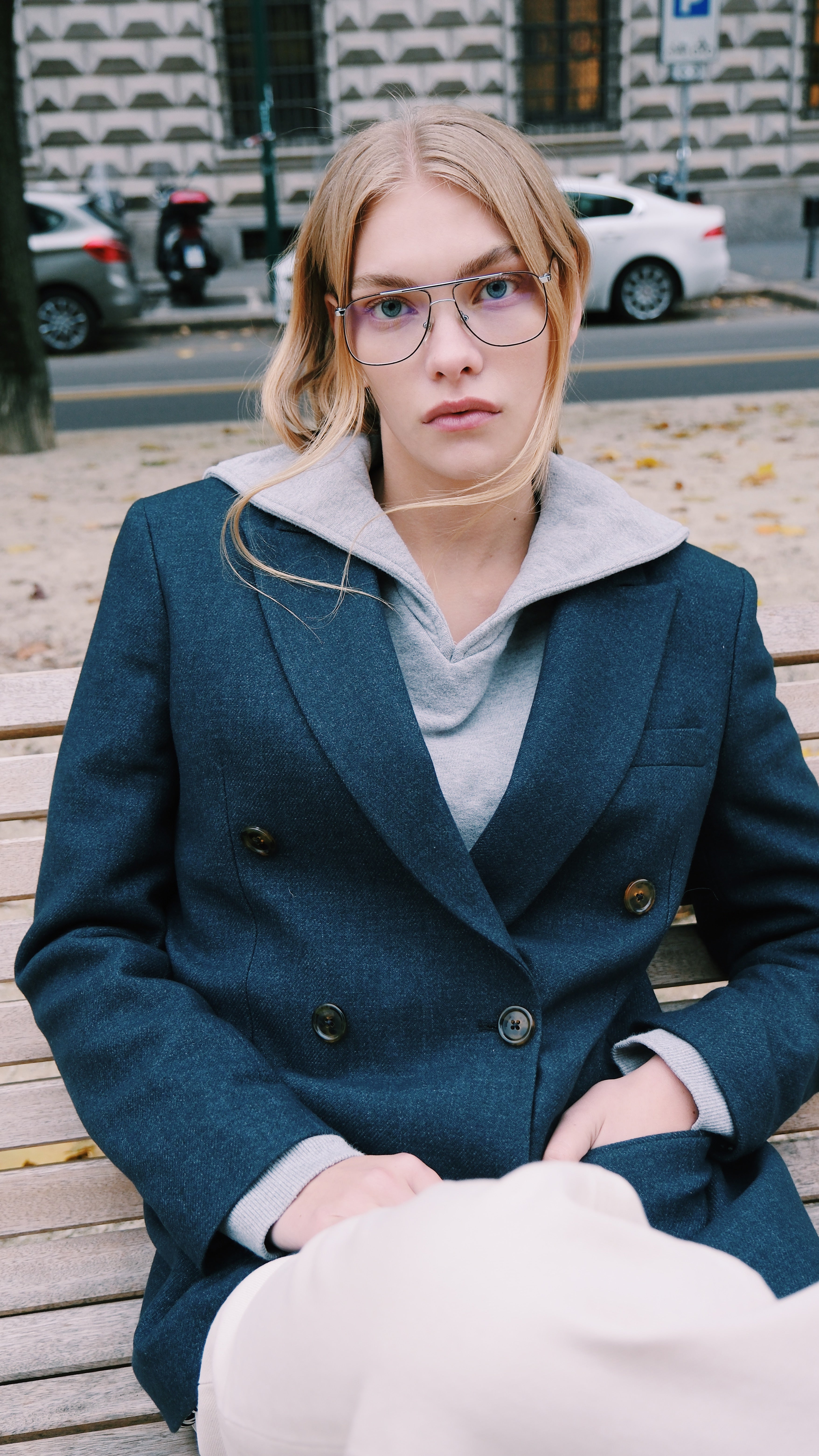 Il tailoring classico del blazer doppiopetto alleggerito da volumi ampi e controllati. Il tessuto segue il movimento, accompagna, non costringe. Linee morbide, animo maschile e stile disinvolto.