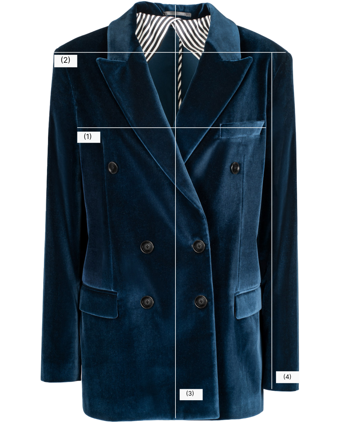Chiusura doppio petto a sei bottoni e tre bottoni ai polsi. Revers pronunciati. Spalle quadrate. Due tasche frontali chiuse a pattina. Mono spacco ribattuto sul retro. Semi foderata e taschino interno a un bottone.