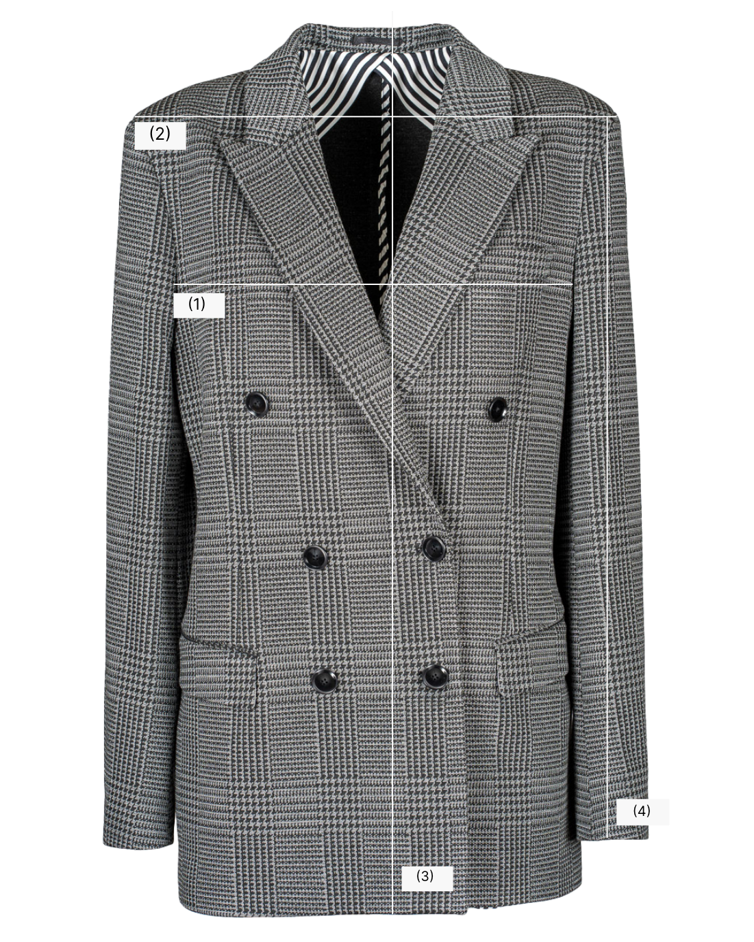Chiusura doppio petto a sei bottoni e tre bottoni ai polsi. Revers pronunciati. Spalle quadrate. Due tasche frontali chiuse a pattina. Mono spacco ribattuto sul retro. Semi foderata e taschino interno a un bottone.