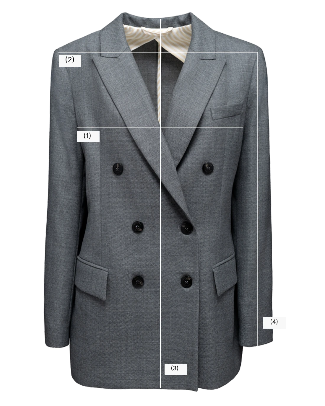 Chiusura doppio petto a sei bottoni e tre bottoni ai polsi. Revers pronunciati. Spalle quadrate. Due tasche frontali chiuse a pattina. Mono spacco ribattuto sul retro. Semi foderata e taschino interno a un bottone.