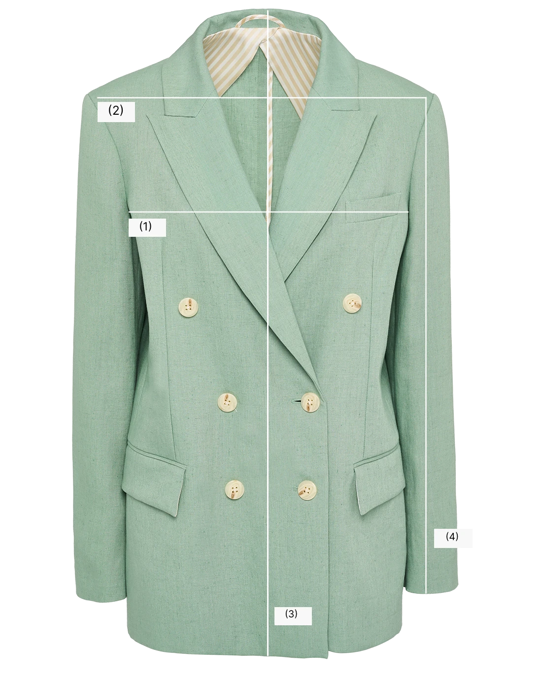 Chiusura doppio petto a sei bottoni e tre bottoni ai polsi. Revers pronunciati. Spalle quadrate. Due tasche frontali chiuse a pattina. Mono spacco ribattuto sul retro. Semi foderata e taschino interno a un bottone.